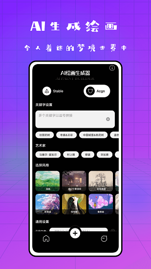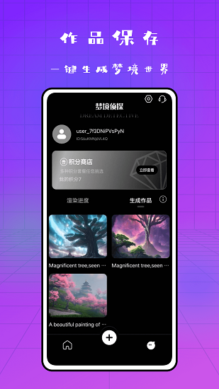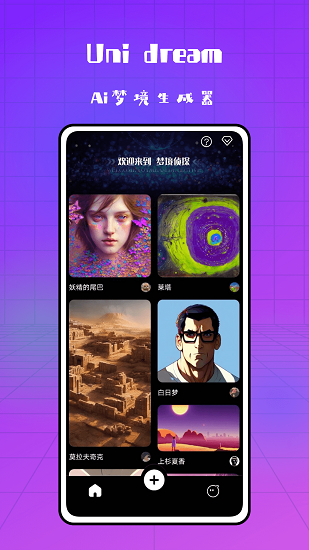 简单描述一下你的想法:“壮丽的树”,“寺庙”等关键词或任何你能想像到的,选择你想要的风格,点击设置、选择图片比例并等待几秒钟,你就能一键开启AI绘画,你能看到你自己创造的元宇宙。与他人分享您的图片或将其用作壁纸,让其他人看到您的天马行空。 Uni Dream 目标是成为大家喜爱的ai艺术生成器之一。