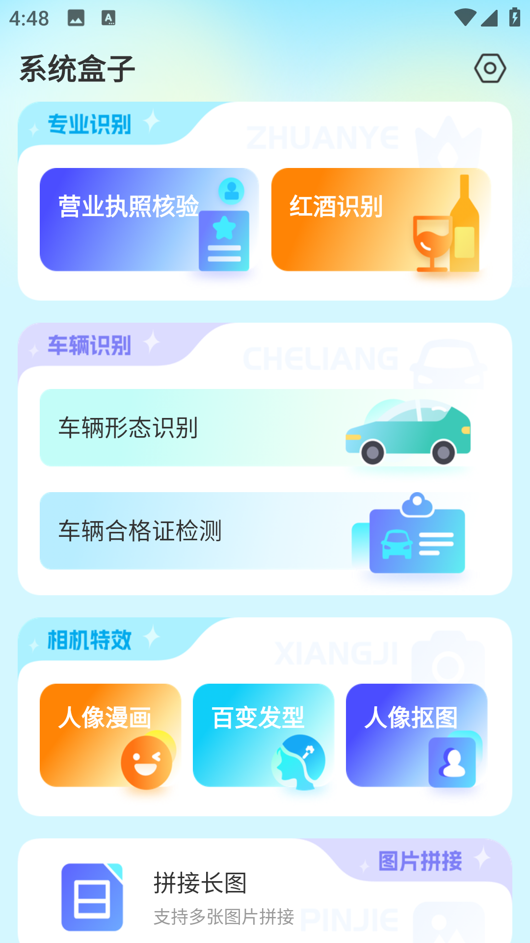 系统盒子app是一款简单好用的识别工具,为大家带来了营业执照核验,红酒识别,车辆识别等多样丰富的识别功能。还有免费的相机特效编辑功能,让你可以制作出各种各样的好看照片,快来下载体验吧!
