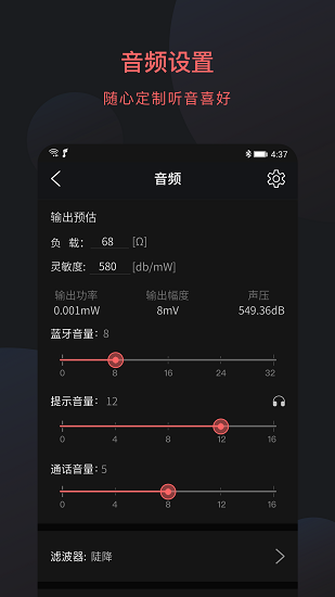 支持均衡器调节;支持相关音频设置,如滤波器、声道平衡等。