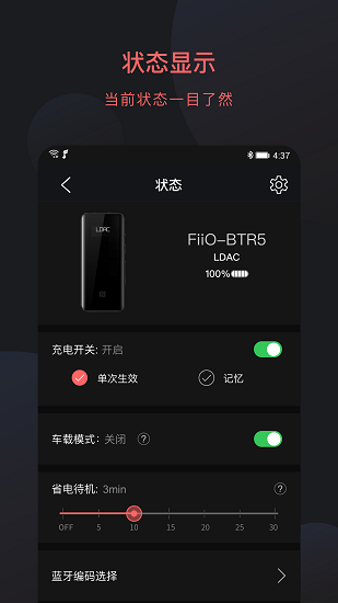 注:目前已支持的型号有Q5、Q5s、BTR3、BTR3K、BTR5、EH3 NC、LC-BT2、UTWS3、BTA30、K9Pro等,后续新品也会及时加入。由于不同型号产品使用的蓝牙、DAC芯片不同,故实际可调节选项也会有所差异,请以实际连接后看到的内容为准