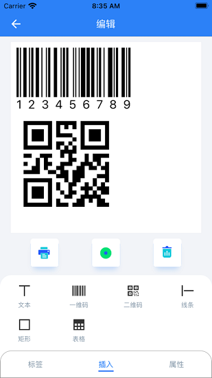 3、小编选择第一个服装的来演示,点击图片进入编辑界面,可以看到界面有上部分是编辑展示,中间是从左往右是打印、多选、和删除、下部分是编辑部分,有标签、插入、属性,可以插入文本、条形码、二维码、图片、logo、线条、矩形、表格。