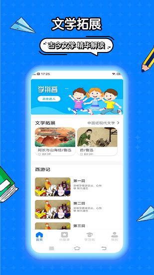 2、同时还为用户提供了很多课外培养学习课程,包括各种国学经典,思维启蒙,英语拓展,科学实验等学习板块。