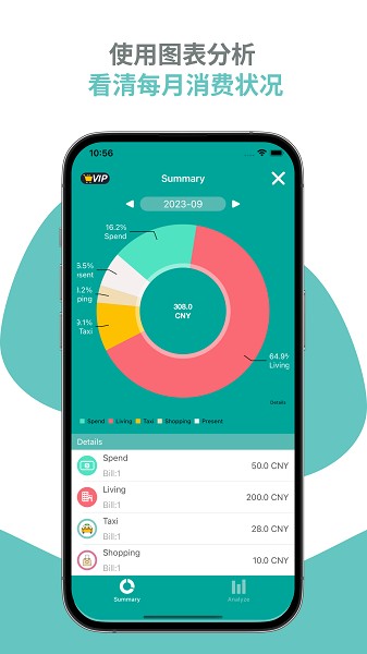 3、让大家查看详细的账单统计图表,分析每个月的收支了。