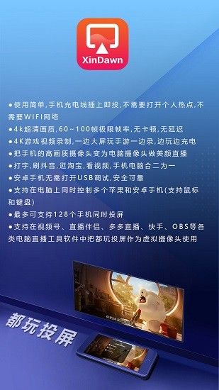 都玩投屏app可以让大家轻松的进行有线和无线投屏,将手机连接到各种电脑设备,可以在电脑设备上显示手机上的画面,想怎么操作都是可以的,基本不会出现严重的延迟,让大家每次打开任意软件和游戏都非常流畅。