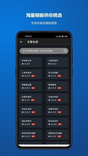 1、平台上带来多种多样的文章模板,能轻松查阅自由选择生成。