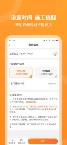 2.师傅可以根据自己的施工时间和技能,自由选择接单,同时可以设置时间,系统会在施工前自动提醒。