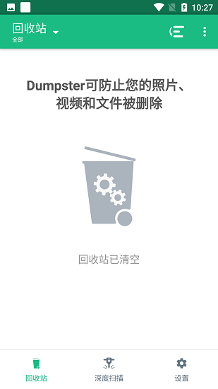 回收站下载手机版中文版app(Dumpster)可以让大家开启手机文件回收站,日常不用担心文件被自己误删除了,这里可以及时找回你删除的文件,日常恢复的速度都非常快,可以恢复到原来的位置,支持的文件格式也是多种多样,轻松的回收。