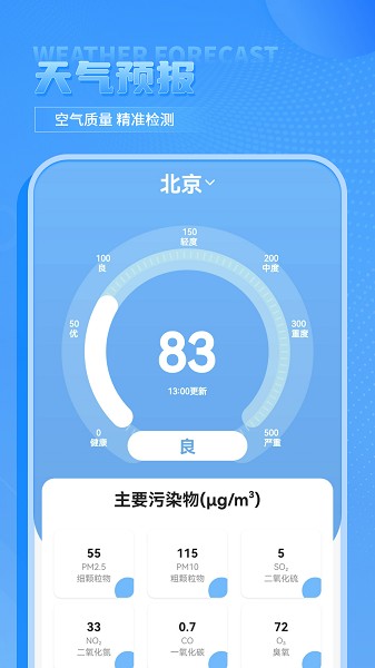 实时获取您当前位置的天气预报和空气质量污染指数。
