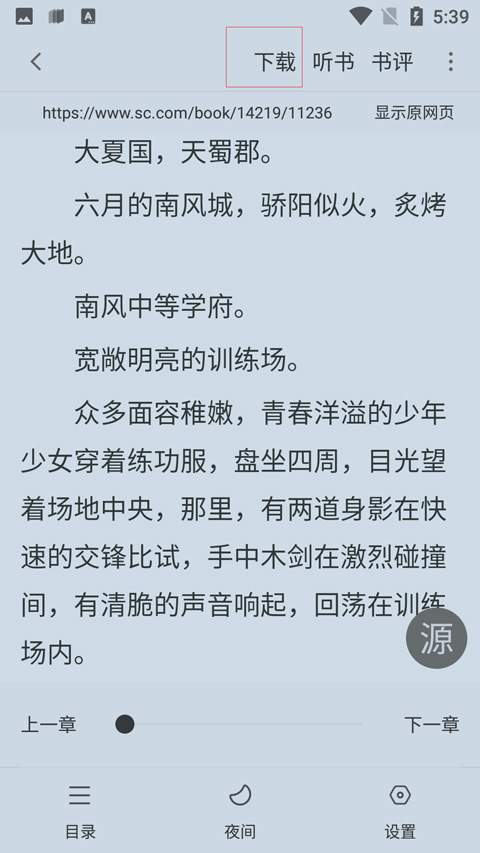 4、在阅读界面,我们需要点击一下屏幕中央,这时候在屏幕的上方便会出现一个功能列表,在列表中就可以找到下载的按钮了。