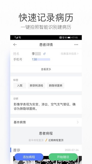 快速便捷记病历,支持多媒体图文语音视频记录。病人的病历、影像、检查结果,个人分析全部放在一起,无需费力整理。随时随地便捷查询,轻松转交与分享病历。是与同行进行病历讨论分享,教学讲课与随访病人时的得力助手。