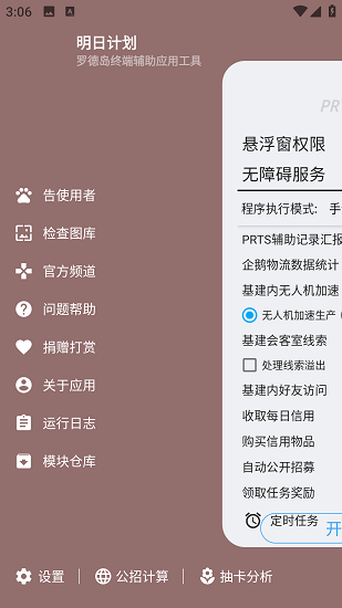 明日计划app明日方舟游戏专用辅助工具,在这里可以根据需求设置各项参数,无论是数值或者开关都是可以设置的,还可以安装新的辅助插件,让大家在游戏中快速的启动辅助,运行起来都非常的流畅,使用起来也都很安全。