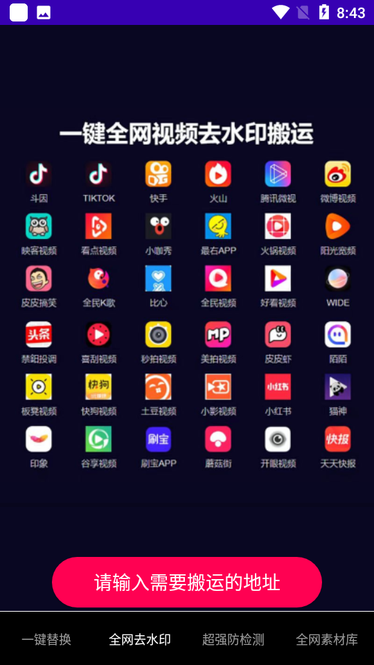 6.该软件支持一键全网短视频平台去水印搬运,可以采集全网30余家短视频平台,让用户轻松获取自己想要的素材。