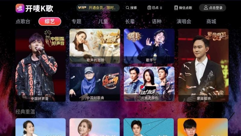 2、打开电视机的开唛K歌,在主界面可以看到点歌台、最近唱过、已点歌曲、经典金曲榜、酷我情歌榜、热门歌单、热门榜单等选项入口。