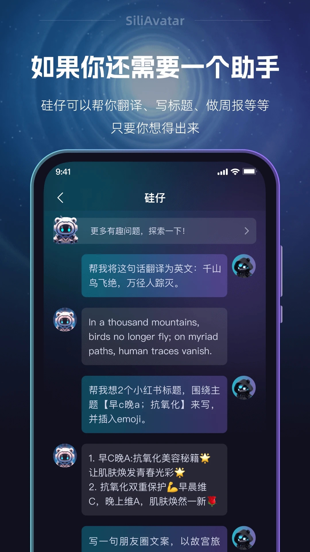 硅么app是一款多功能的ai智能手机软件,为大家带来了特色的时空交流对话功能,让你可以和历史上的名人进行对话,采用ai智能演算与你进行实时的交流沟通。还为大家带来了很多的智能服务,非常的简单好用。