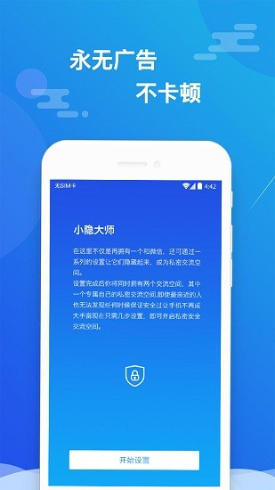 不做任何广告不收集数据,我们承诺小隐大师坚持纯净产品,永无广告,无需注册 ,做纯净的双开隐私管理产品。