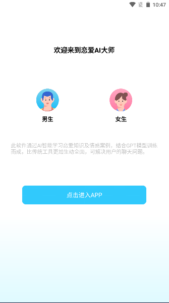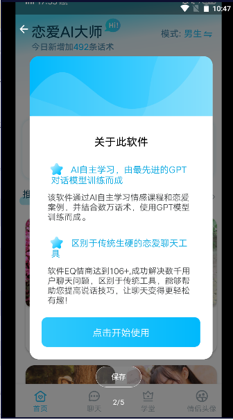 该软件是通过人工智能自学情感课程和爱情案例开发的,结合数万个脚本,并使用GPT模型进行训练。