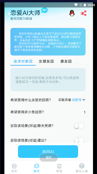 恋爱AI大师app是一款可以教你进行聊天的恋爱智能教学软件,为大家带来了最新的网络高情商回复教学,让你也能成为恋爱大师。为大家带来了恋爱回复语录,让你可以跟着回复非常的方便,快来下载体验吧!
