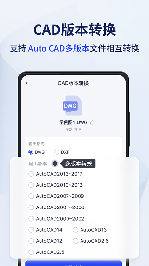 支持CAD图纸DWG和DXF格式的互转,以及支持多种图纸版本的互转。