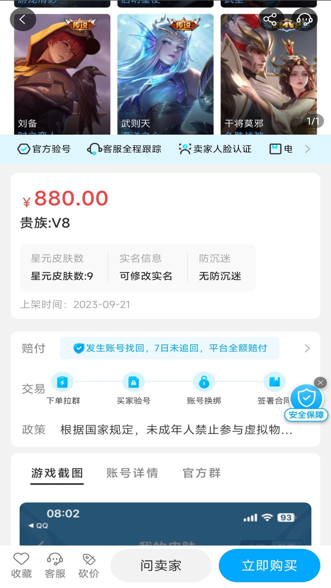 客服提供专业验号教程,买家上号验号,如发现账号内容不符,可无责取消交易。