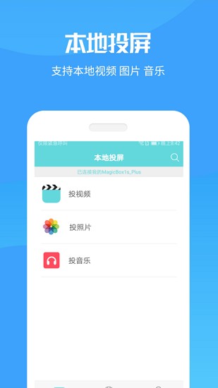 可将本地媒体一键投屏到电视屏幕互联网盒子上,支持视频,图片,音乐等,大屏幕分享更畅快