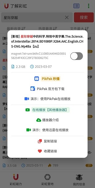 彩虹磁力搜索引擎官网app可以让大家在这里搜索全网超多的磁力资源,每天的持续的进行更新,让大家输入关键词就可以显示对应的资源了,能够进行智能的过滤,每个磁力资源都可以快速调用下载器,让大家快速的下载。