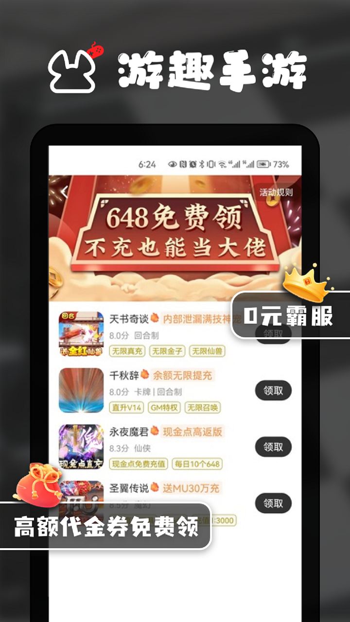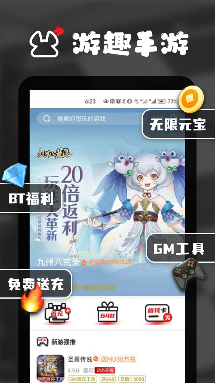 游趣平台手游app,包含上千款热门bt游戏,包括仙侠、MMO、卡牌、传奇等各种游戏品类,并为玩家提供0元首充,648直接领,省钱卡等超值福利!