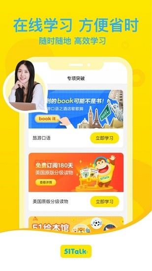 51Talkapp官网版专门为少儿英语打造的学习平台,能够在这里自由选择各种学习套餐,轻松的制定自己的英语学习计划,每天想什么时候在线学习都是可以的。新人注册平台可以领取超多的福利,快速体验各种英语课程。