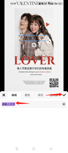 2、点击选中需要编辑的文字,你可以对文字的内容、颜色、样式以及透明度进行编辑。