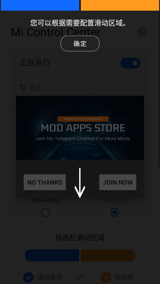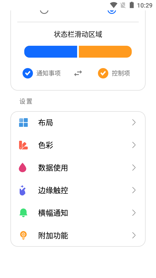 2.以控制中心为例,可以调整状态栏的滑动区域,切换通知项和控制项的位置。