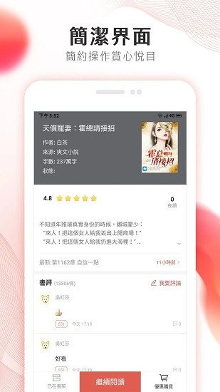 仿真3D翻页,离线下载,切换字体,切换背景,夜间模式,精美图书封面,内容整齐排版,几十种细节体验多重呵护。