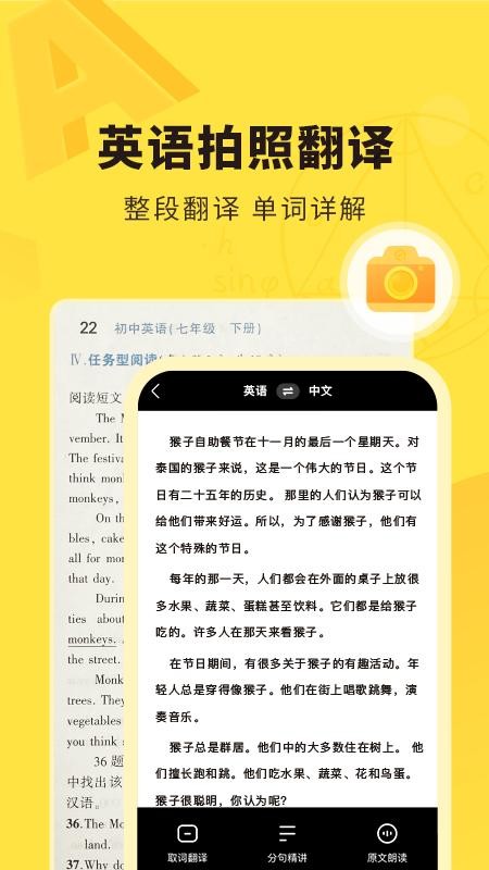 2)『英语拍照翻译』功能来了!轻轻一拍即可整段翻译、取词翻译和原文朗读。“取词翻译”,生词一点即会;“原文朗读”,发音指导,还支持多倍速哦~用快对,精准识别图文,翻译又快又准,英语阅读理解更轻松!