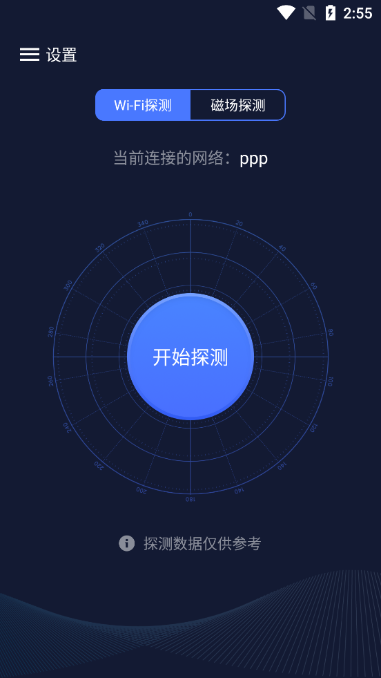 针孔摄像头探测是一款手机扫描探测工具,支持两种方式检测附近是否有摄像头,一种是wifi检测,一种是磁场检测,它非常强大且易于使用旅游、住宿酒店的必备品,而且这款软件占比也非常小,有需要的用户可以下载来试试。