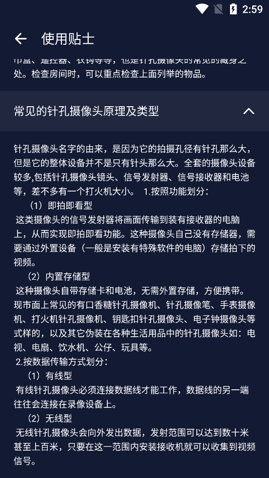 2、免费的针孔摄像头检测APP包含两种实用的检测方法;