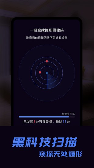 奇趣酒店防偷窥探测器最新版app可以让大家在手机上就可以专业扫描周围的各种隐藏的摄像头,市面上常见的摄像头基本都可以扫描出来,还可以显示摄像头所在方位,让大家遇到隐藏摄像头都可以拆除,防止自己被偷拍。