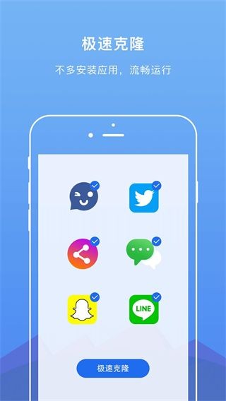 3.允许后就会弹出添加页面,这里会显示出手机中已安装的所有应用,选择想要多开的应用直接打钩然后点击克隆即可。