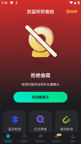 防监听防偷拍app最新版可以让大家在这里轻松的检测周边的偷拍设备,能够让大家出门在外注意自己的安全,防止自己被各种隐藏摄像头偷拍了,在住宿的时候都可以打开软件进行深度扫描,从多个方面扫描隐藏摄像头。
