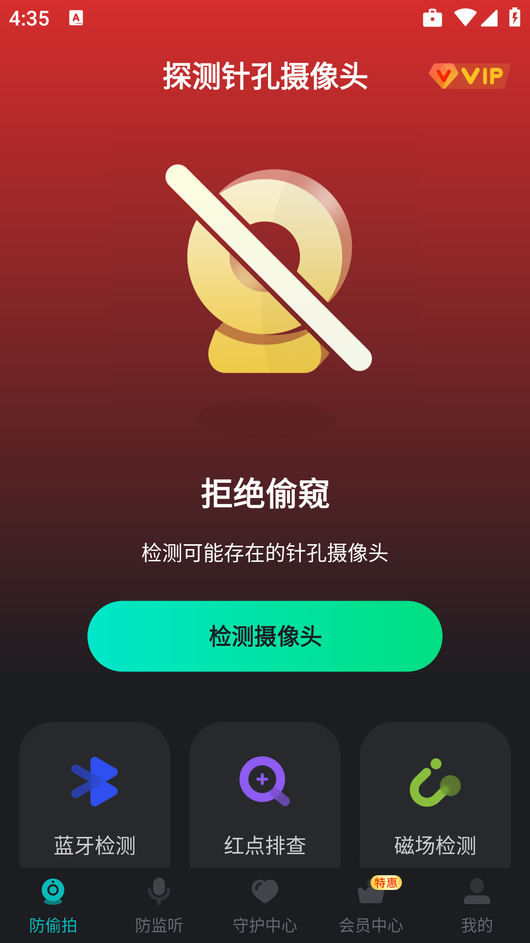 针孔摄像机探测app是一款可以通过电磁检测帮助你找到隐藏摄像头的实用工具,为用户带来了摄像头检测,监听检测,安全防护等等多种功能,保证你的外出居住安全,快来下载体验吧!