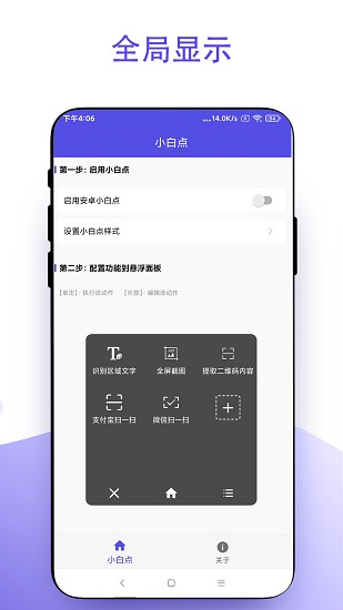 1、在小白点的设置页,我们可以看到最上方的开关是处于开启状态的,这时候小白点悬浮球也是出现在屏幕上。