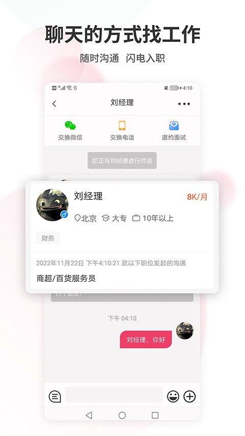 1、通过聊天找工作,就像微信App一样,随时随地预约,当场决定,快速录用。