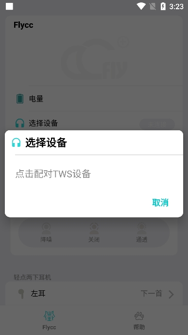 2、进入此app点击“选择设备”按钮进入已配对设备列表,点击对应的耳机设备,使app与该耳机建立连接,连接成功后耳机上的配置信息将自动同步到app。