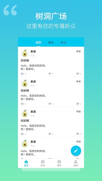 3、可以匿名投稿自己的记事内容,将自己的烦恼或者不开心的事情丢进树洞。