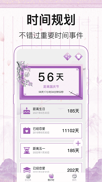 帮你记录生活中重要的日子,包括记录纪念日、朋友生日、考研高考倒数计时、重要的出游日子,让你能从容安排自己的生活,又能轻松记录下那些特别的日子。