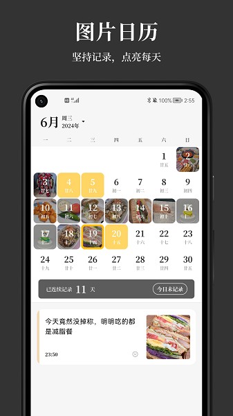 对于个人每日所记录的内容,会在日历图中自动进行打卡,让你第一时间进行查看。