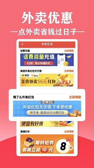 优惠覆盖美团外卖、饿了么,生活处处有优惠,有事没事上找券,更多惊喜等你发现,更多返利更多优惠。