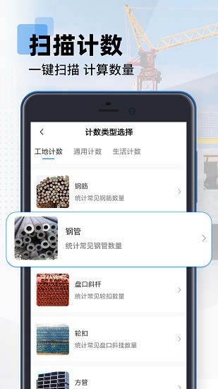 掏出手机、对着物体拍照、智能识别出物体的数量、包括但不限于钢管、方管、椭圆管等工地常见的物体。