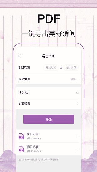 日记图文批量导出,一秒速成PDF文档。精美的排版导出成PDF,随时备份,更可以打印成册。 一键生成精美的长图进行分享。