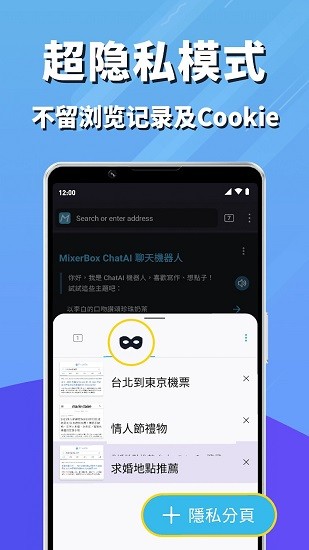 切换到隐私浏览模式,Cookies 不留存,更能安心上网。你可以在分页画面左右滑动,以切换一般模式及隐私模式。