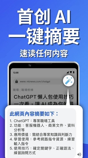 MixerBox AI 为第一个搭载 ChatGPT 的繁体中文版浏览器,写作、翻译、对话,快速产出、无限可能!搜寻关键字时,AI 即自动产出创意回答,省去浏览多个网页的时间。
