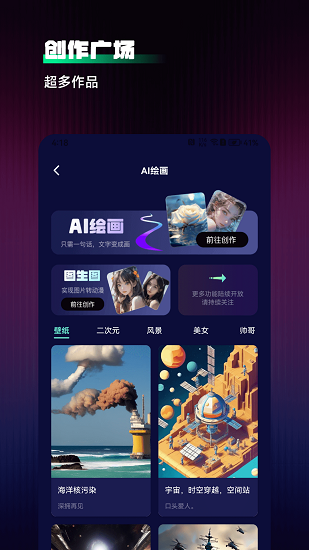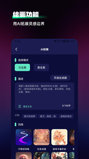 输入一段描述词,选择您想要的风格,便可生成如梦境般的绘画作品。描述词越丰富,创造出来的图片就会觉得越有色彩性,都是可以自由设置生成的参数,很方便。