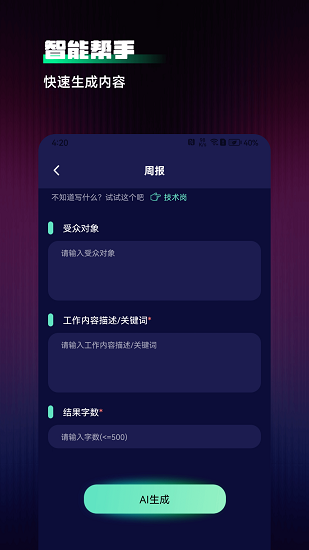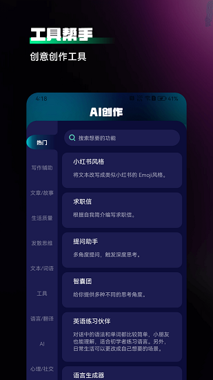 输入自己感兴趣的关键词,它就能自动生成对应的各种各样的作文、诗歌、学习计划等。无论你是在写作它都可以满足你的需求,为你提供更学习、娱乐,多创意和灵感。
